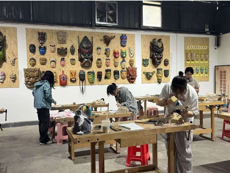 木工坊里,此起彼伏的木槌声与年轻人的欢声笑语相互交织,让古老的傩面有了另一种“新面孔”。
