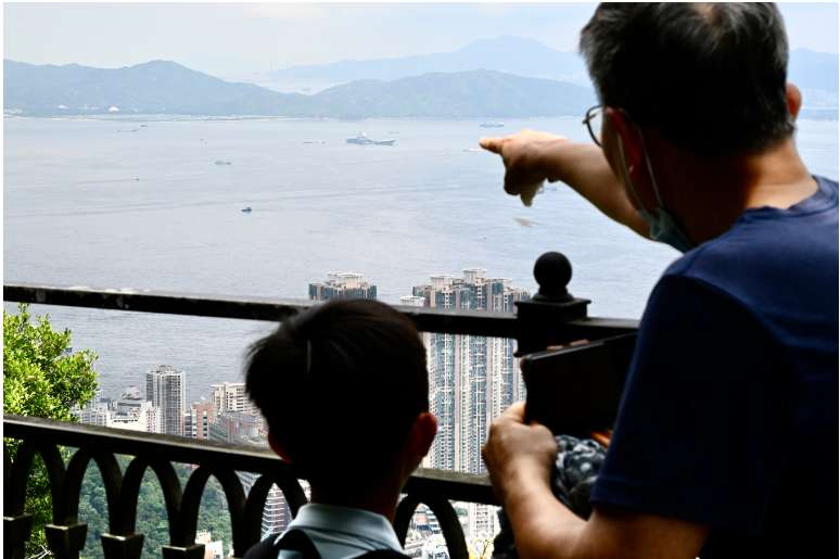7月3日,由中国解放军海军航空母舰山东舰,导弹驱逐舰延安舰、湛江舰及导弹护卫舰运城舰组成的航母编队抵达香港,开启为期5天的访问活动。航母编队访港吸引香港民众关注。图为一名男士向小朋友提示山东舰停泊的位置。