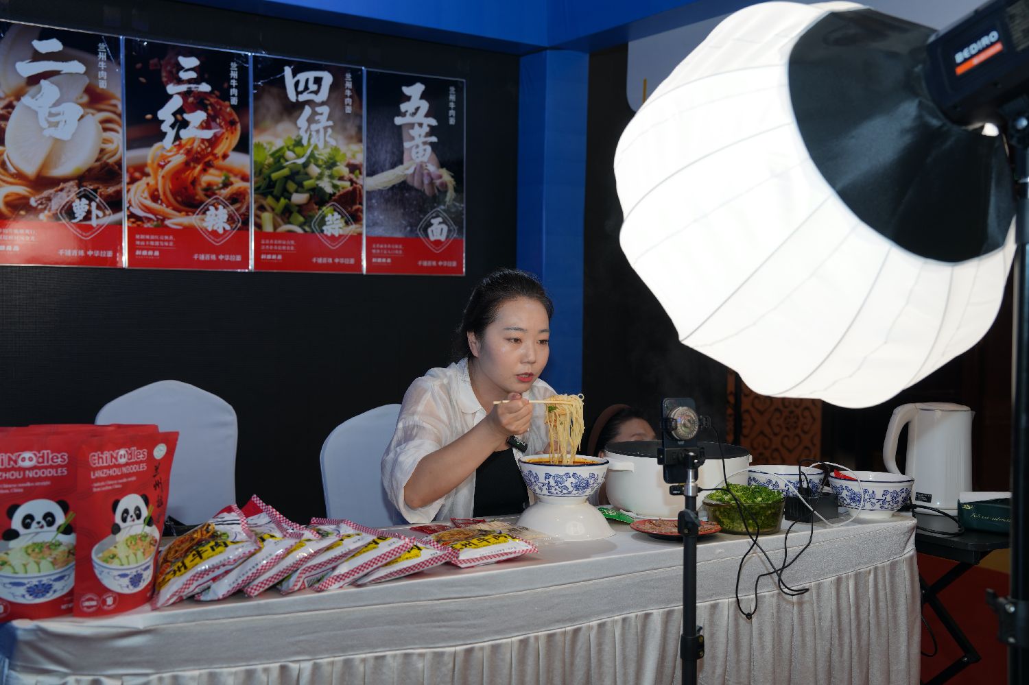 7月7日,工作人员在兰州牛肉拉面直播间展示热气腾腾的拉面。(图片来源:中新社)