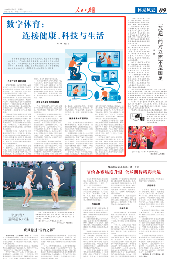 智能穿戴设备、5G赛事直播、AI运动处方……近年来,科技持续助力体育发展,在全民健身、竞技体育、体育产业等多方面不断“上新”,成果显著,数字体育正逐步从辅助工具转向产业核心引擎。