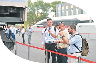 7月9日,第十二届世界高铁大会“高铁创新之旅”活动现场,参会代表在室外实车展示区进行观摩。