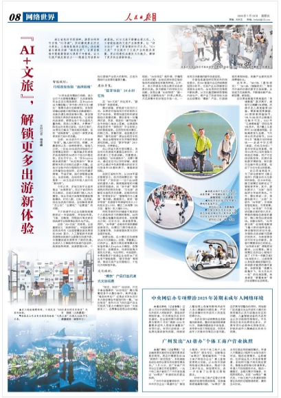 浙江省杭州市西湖畔,游客扫码即可召唤“AI导游”,实时解说景点历史与典故;上海海昌海洋公园内,仿生鲸鲨与游客共游“海底世界”;甘肃省敦煌市莫高窟借助AI复原千年壁画,让文化遗产焕发新活力……随着应用场景加速落地,AI与文旅不断擦出新火花,人工智能绘就的文旅产业新图景,让“诗与远方”有了更智慧的打开方式。“AI+文旅”不仅提升了文旅产业的服务质量,更以创意玩法激发文化魅力,解锁了更多的出游新体验。