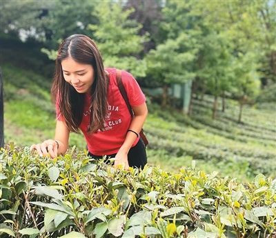 参加研学的香港中学生在峨眉山峨眉雪芽有机茶园体验采茶。