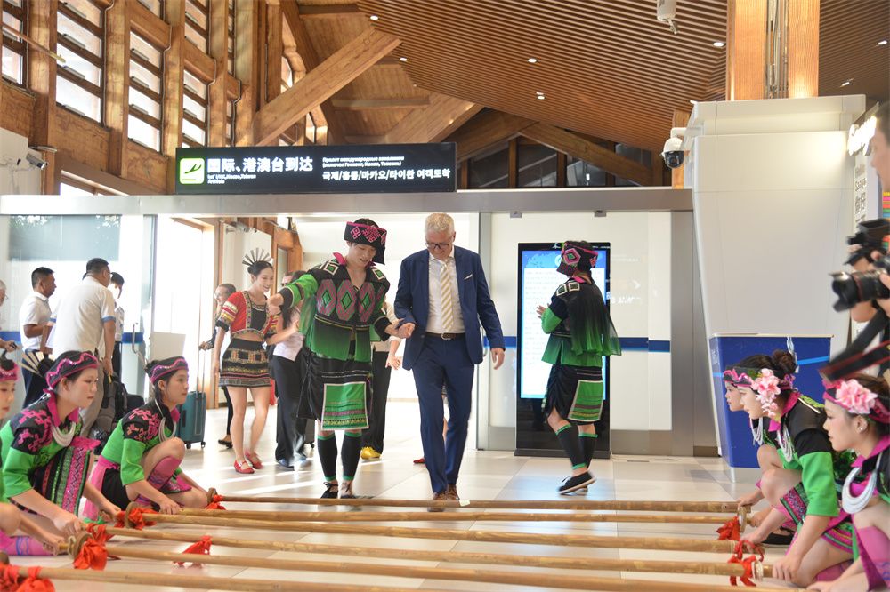 7月27日,德国游客在三亚凤凰国际机场体验黎族竹竿舞。(图片来源:中新社)