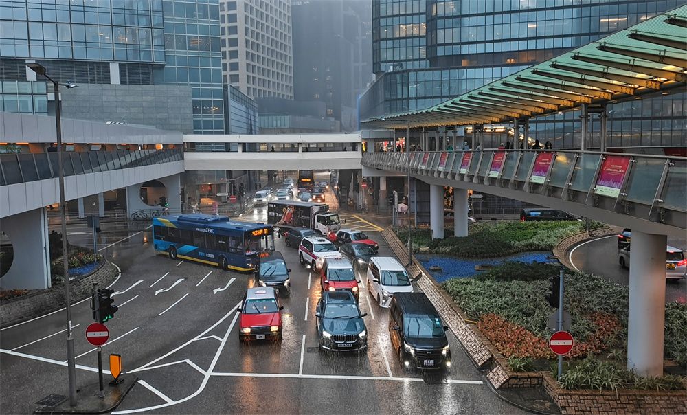 香港多条主要交通干线如干诺道西、德辅道西等,车辆通行基本顺畅,偶尔有公交车因路面积水减速,但未出现熄火或拥堵。