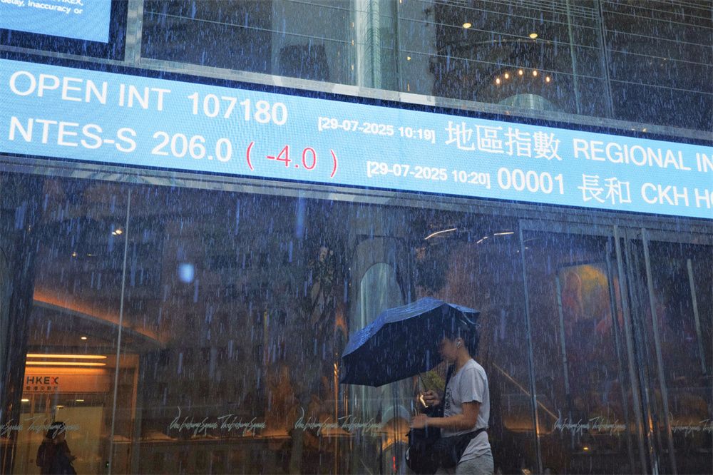 7月29日9时10分,香港天文台发布黑色暴雨警告信号,香港交易所根据2024年起实施的“恶劣天气交易安排”,香港的证券及衍生产品市场按照既定交易日历运作。图为香港中环交易广场的电子信息屏幕在黑色暴雨警告信号生效期间显示交易信息。