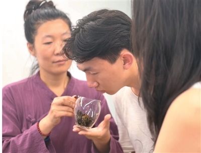 茶艺课上,一名学生正在通过闻香了解茶叶。