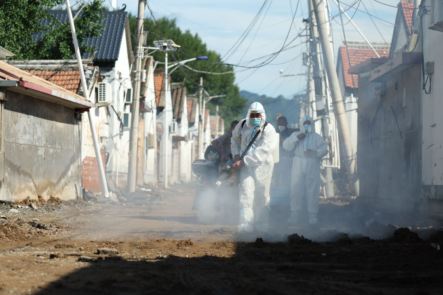 8月5日,在北京市密云区北庄镇朱家湾村,工作人员在进行消杀作业。7月23日至29日,北京市遭遇极端强降雨,密云、怀柔、平谷、延庆等北部山区突发山洪,造成重大人员伤亡和财产损失。(图片来源:中新社)