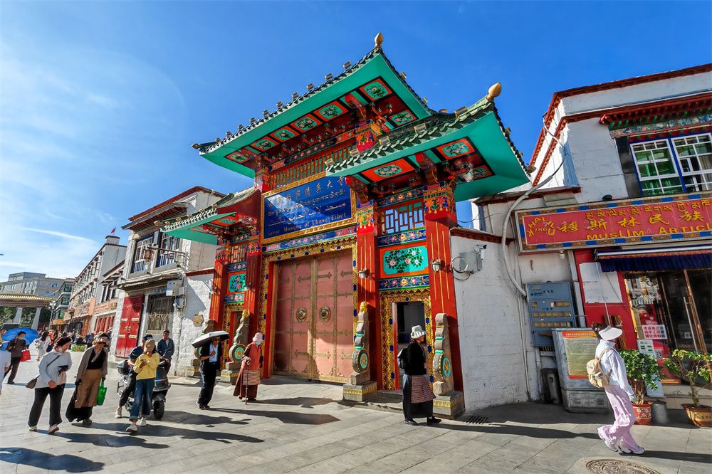 8月1日,蓝天下,拉萨清真大寺的大门体现出斗拱结构和藏式涂装风格的结合。(图片来源:中新社)