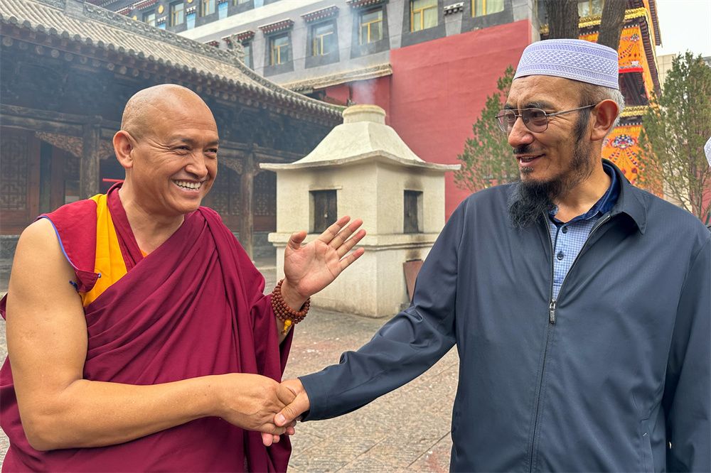 2024年7月,拉萨市政协副主席、清真大寺教长亚古(右)到访青海省宏觉寺,与藏传佛教僧人交流。(图片来源:受访者供中新社)