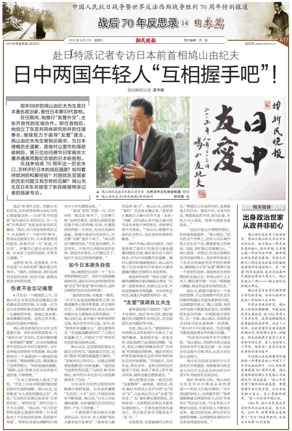 二战结束70周年之时,新民晚报特派记者专访鸠山由纪夫的报道。图源:资料图