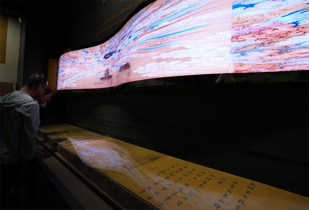 8月5日,观众正在西藏博物馆内欣赏《普渡明太祖长卷图》动态演示图。