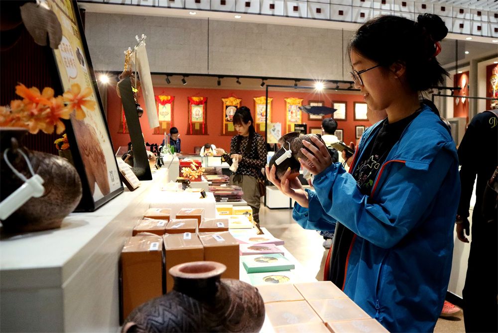 8月5日,游客在西藏博物馆文创店内挑选双体陶罐系列文创产品。