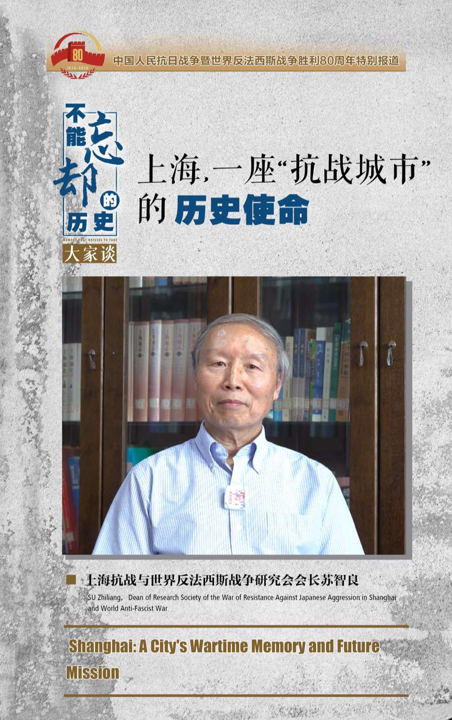 在中国人民抗日战争暨世界反法西斯战争胜利80周年之际,回顾那段历史,深耕上海城市史研究40余年的上海抗战与世界反法西斯战争研究会会长苏智良感慨良多。他用自己多年研究的经历告诉我们,为什么80年后,我们仍然需要重读这座城市的“抗战故事”,铭记这座城市所作出的杰出贡献。