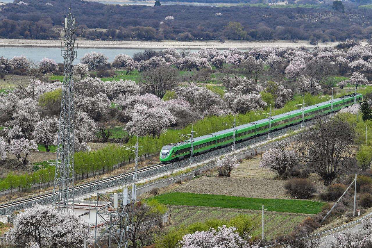 雅鲁藏布江河谷中,拉林铁路上的复兴号列车呼啸而过。自2021年6月开通运营以来,拉林铁路有力推动了区域经济和民生发展。