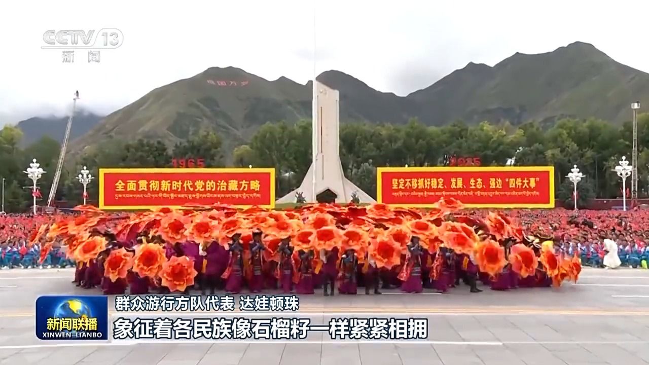 群众游行方队代表达娃顿珠:我们组成的同心圆造型,象征着各民族像石榴籽一样紧紧相拥。作为青年学子,我们要牢记总书记的嘱托,以挺膺担当的姿态,投身中国式现代化建设,用实际行动回报党和国家。