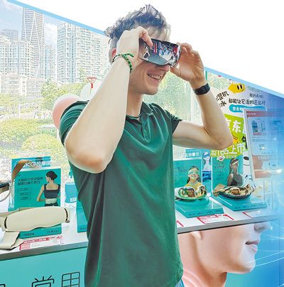 在深圳福田区华强北群星广场购物中心,来自德国的小伙子凯试戴电子眼部按摩仪。