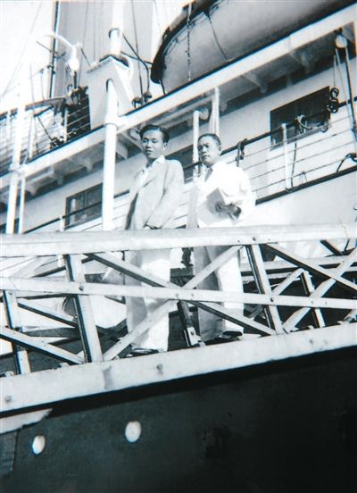 1939年6月初,符克率越南琼崖华侨回乡服务团42名团员,乘轮船取道香港回琼参加抗战。图为符克(左)在轮船上留影。资料图片(受访者提供)