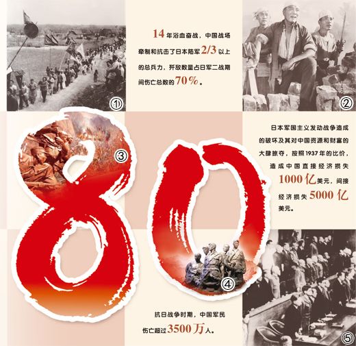 作为东方主战场,中国付出了伤亡3500多万人的民族牺牲,抗击了日本军国主义主要兵力,对日本侵略者的彻底覆灭起到了决定性作用。正如毛泽东同志所指出的,这是“战争史上的奇观,中华民族的壮举,惊天动地的伟业”。