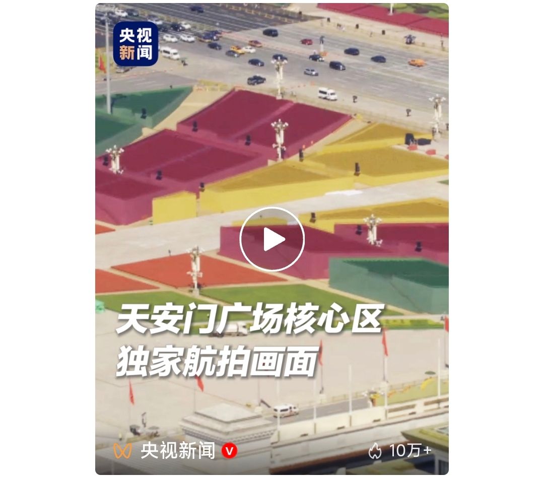 此次的广场布置细节满满,临时观礼台整体呈现三个“人”字,形成“三人为众”的概念。一起来看最新航拍画面👇