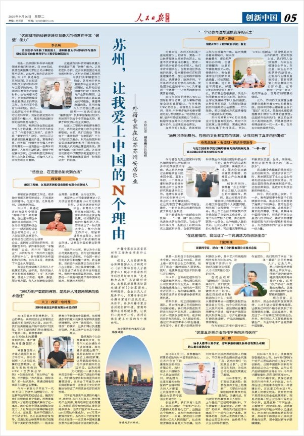 我是一名深耕材料科学与能源领域的海归科学家。自1988年起,我便在美国摩托罗拉公司从事前沿技术研发。2012年,我决定返回中国。2015年,我选择在苏州定居,并出任苏州科技大学材料科学与工程学院院长,带领团队聚焦先进功能材料、生物传感与芯片、光电能源转换及绿色能源技术的研发工作,在苏州至今已有10年时间。作为一名经历过中外科研生态对比的科学家,我深切感受到苏州在吸引外籍人才、推动科技创新方面的独特优势与潜力。