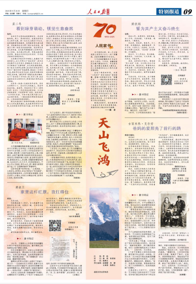 在这个特别的时刻,本报“人民家书”将目光投向广袤的新疆,摘编4封跨越时空的“新疆家书”——梁狄刚在致母亲的信中表明志向并在今后的岁月中以行动践行,他在塔里木盆地的坚守就是生动的注脚;在石河子大学支教的北京大学教授孟二冬在写给妻子的信里尽显师者仁心;军嫂淑兰告诉戍边的丈夫“家里这杆红旗,我扛得住”;维吾尔族姑娘古丽米热·艾尔肯和父母分享大学生活的美好。