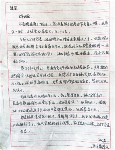 龚淑兰写给丈夫王建国的信。