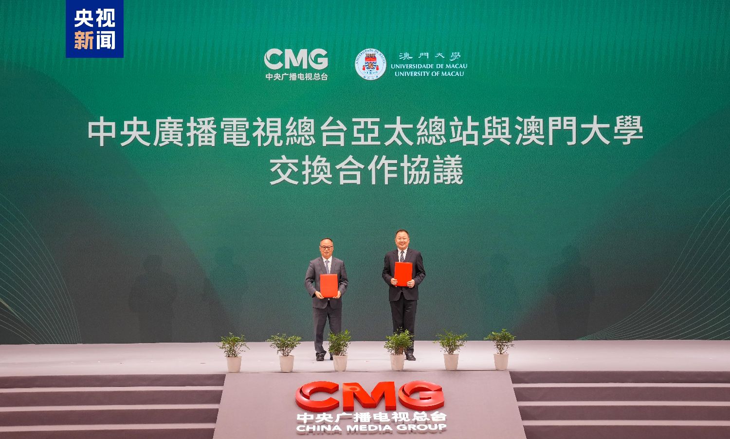 △中央广播电视总台亚太总站站长曹毅与澳门大学校长宋永华交换合作协议