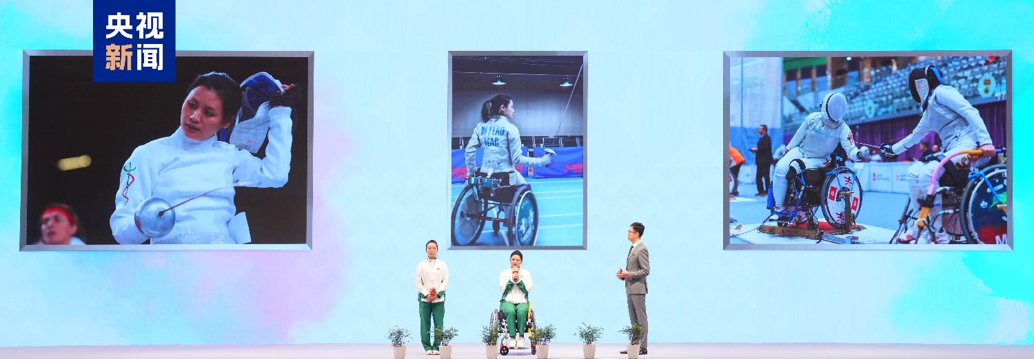 △中国澳门武术运动员李祎、中国澳门轮椅击剑运动员刘燕仪现场推介节目