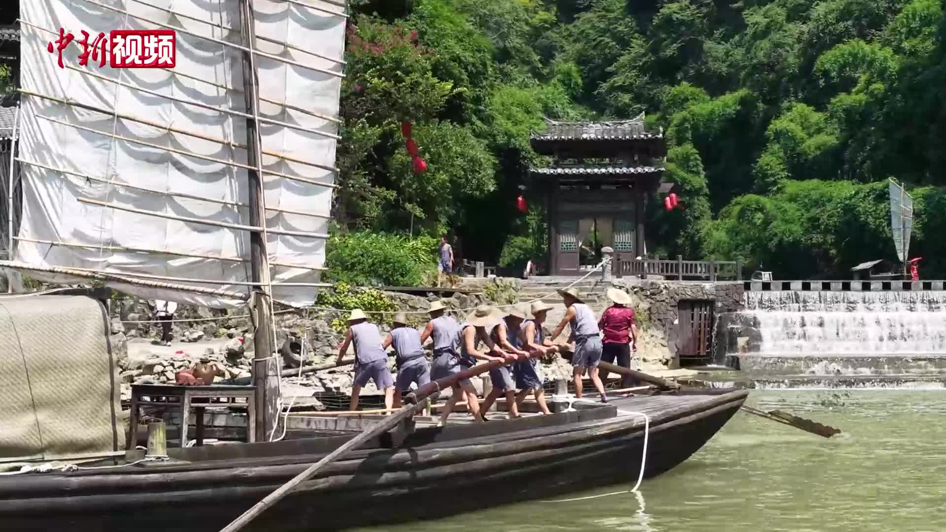 7月30日,湖北省宜昌市夷陵区三峡人家景区实景舞台上,“船工”升帆摇橹喊号子。周星亮摄