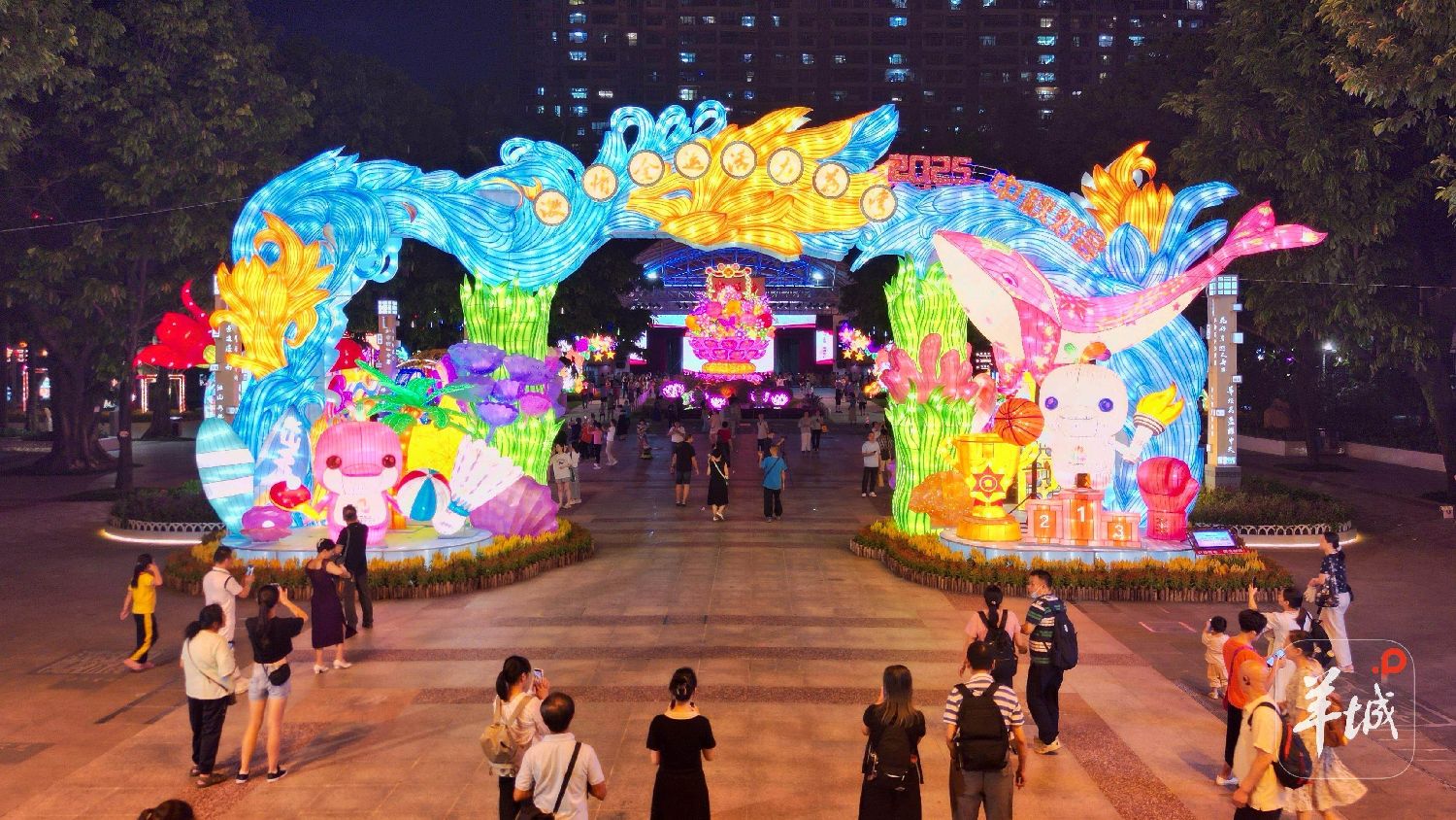 本届中秋灯会紧扣“喜迎十五运”主题,以《乘风破浪海天阔》为核心灯组,也是正门门楼造型,十五运会吉祥物彩灯“喜洋洋”“乐融融”与多项动态运动项目巧妙融合,这也是广州首个以彩灯形式呈现的全运会吉祥物。该彩灯通过扎作工艺与现代灯光技术,呈现运动节奏与光影律动的视觉盛宴。
