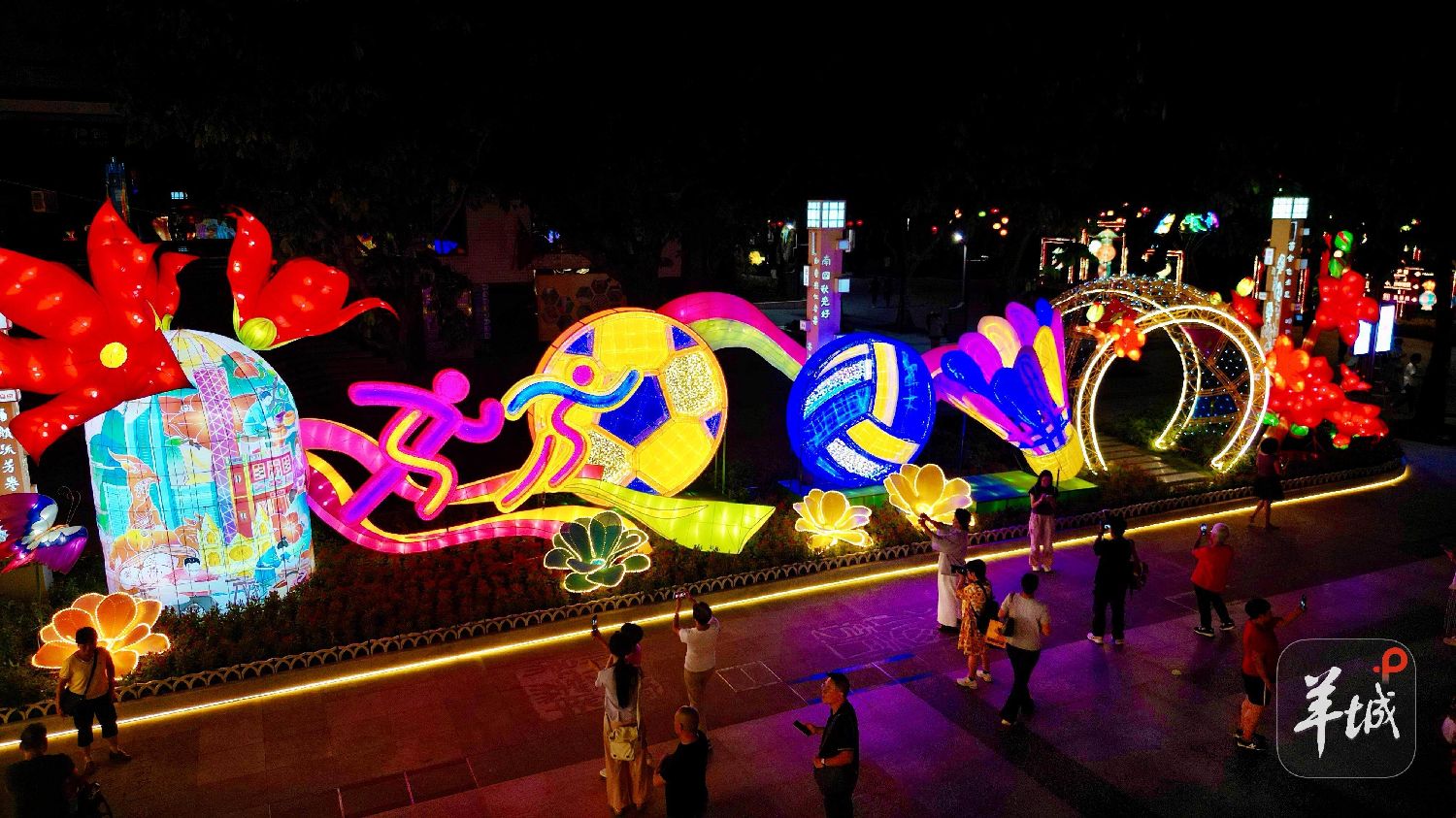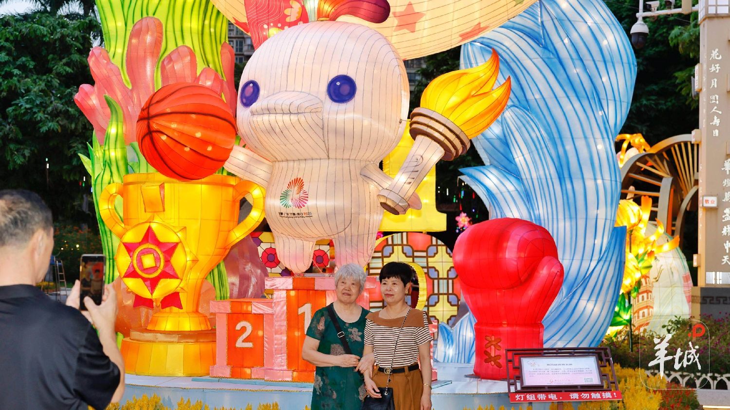 灯组上苍劲有力的“激情全运活力荔湾”主题字,是由2010年亚运会题写志愿者口号“一起来更精彩”的书法家乔平老师书写,展现了体育精神的传承。