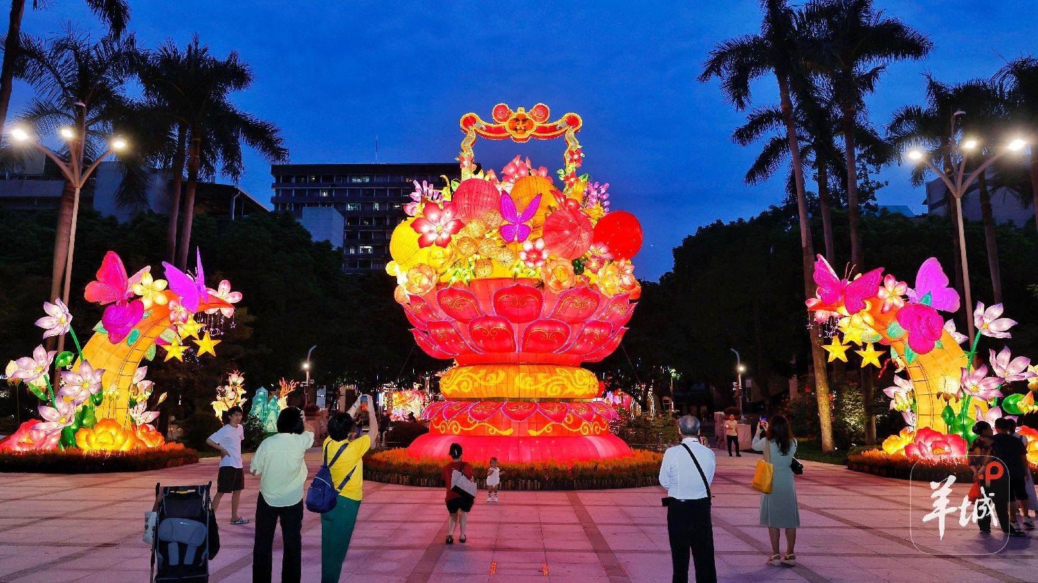 公园中心广场上,有一个古典大花篮造型,灯组以鲜花和岭南佳果为创作主体