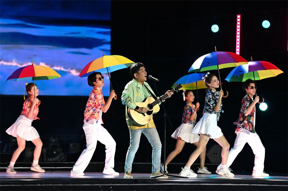 10月5日晚,“月是故乡明——2025海峡两岸(漳州)中秋晚会”在福建省漳州市东山县举行。图为台湾歌手叶佳修演唱《外婆的澎湖湾》。(图片来源:中新社)