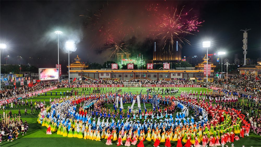 2025年国庆中秋假期期间,各国球员、球迷与榕江民众欢聚贵州“村超”球场,跳侗族“多耶舞”。(图片来源:中新社)
