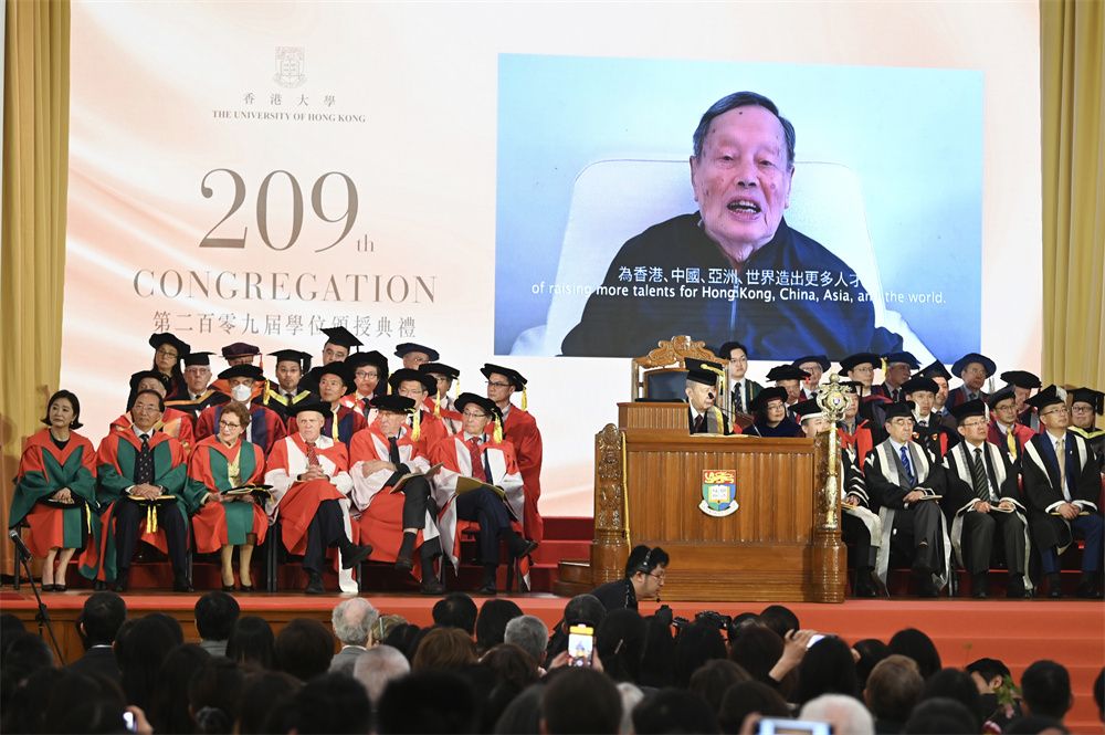 2023年4月3日下午,香港大学举行第209届学位颁授典礼,诺贝尔物理学奖得主、中国科学院院士、著名物理学家杨振宁获颁授荣誉博士学位。图为杨振宁以视频方式向香港大学致谢。(图片来源:中新社)