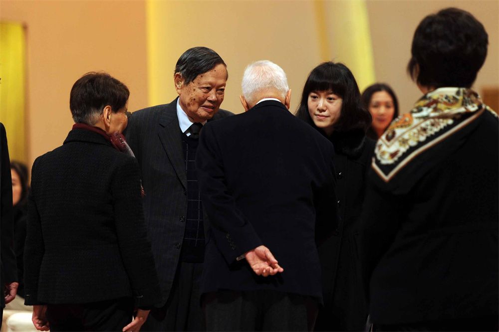 2014年1月17日,香港电视广播有限公司荣誉主席邵逸夫先生追思会在香港举行,杨振宁(左二)、翁帆(左四)夫妇前往悼念。(图片来源:中新社)