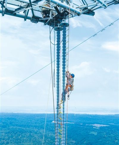 位于江苏省淮安市的1000千伏淮盱Ⅱ线检修现场,江苏省送变电有限公司检修人员对复合绝缘子进行更换作业。