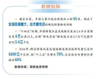 ——2024年,跨区特高压直流通道输送清洁能源电量占总送出电量的比重接近60%
