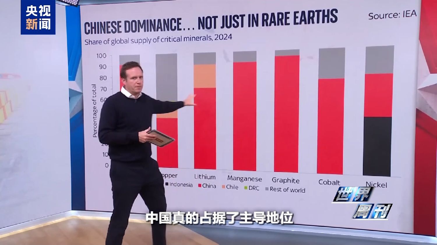 英国天空新闻主持人:看看铜、锂、锰、石墨、钴,中国真的占据了主导地位。多年前中国就决定,在这些供应链占据主导地位,不仅是供应链,还包括相关的产品。