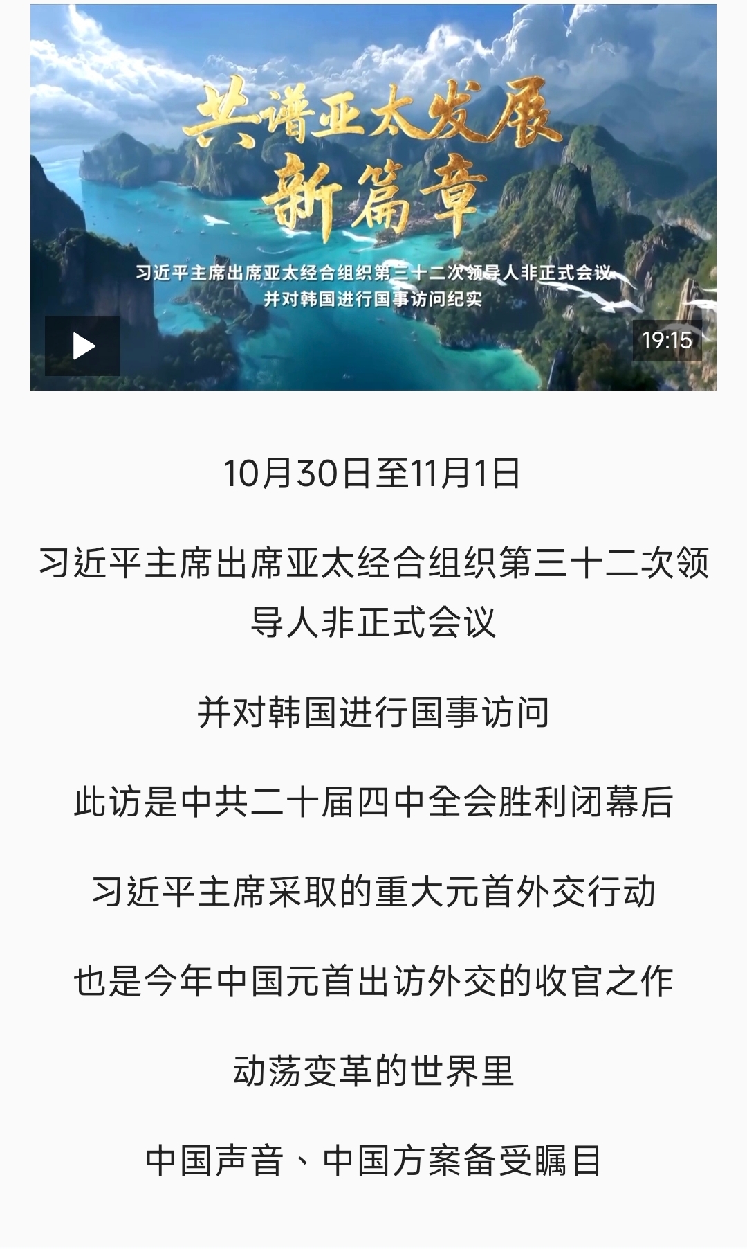 时政纪录片丨共谱亚太发展新篇章——习近平主席出席亚太经合组织第三十二次领导人非正式会议并对韩国进行国事访问纪实