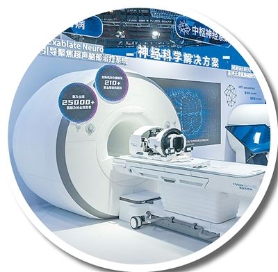 在本届进博会医疗器械及医药保健展区,磁共振引导聚焦超声脑部治疗系统、无液氦脑磁图仪等先进医疗器械一齐亮相。翁奇羽摄(人民视觉)