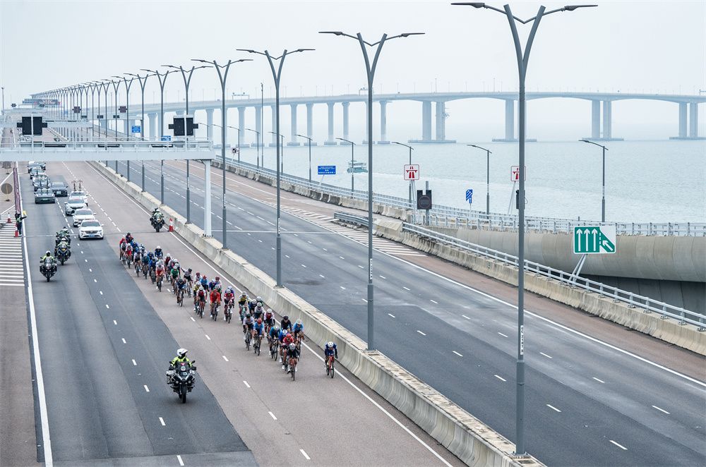 2024年11月24日,十五运会公路自行车测试赛的参赛选手经过港珠澳大桥香港赛段。(图片来源:中新社)