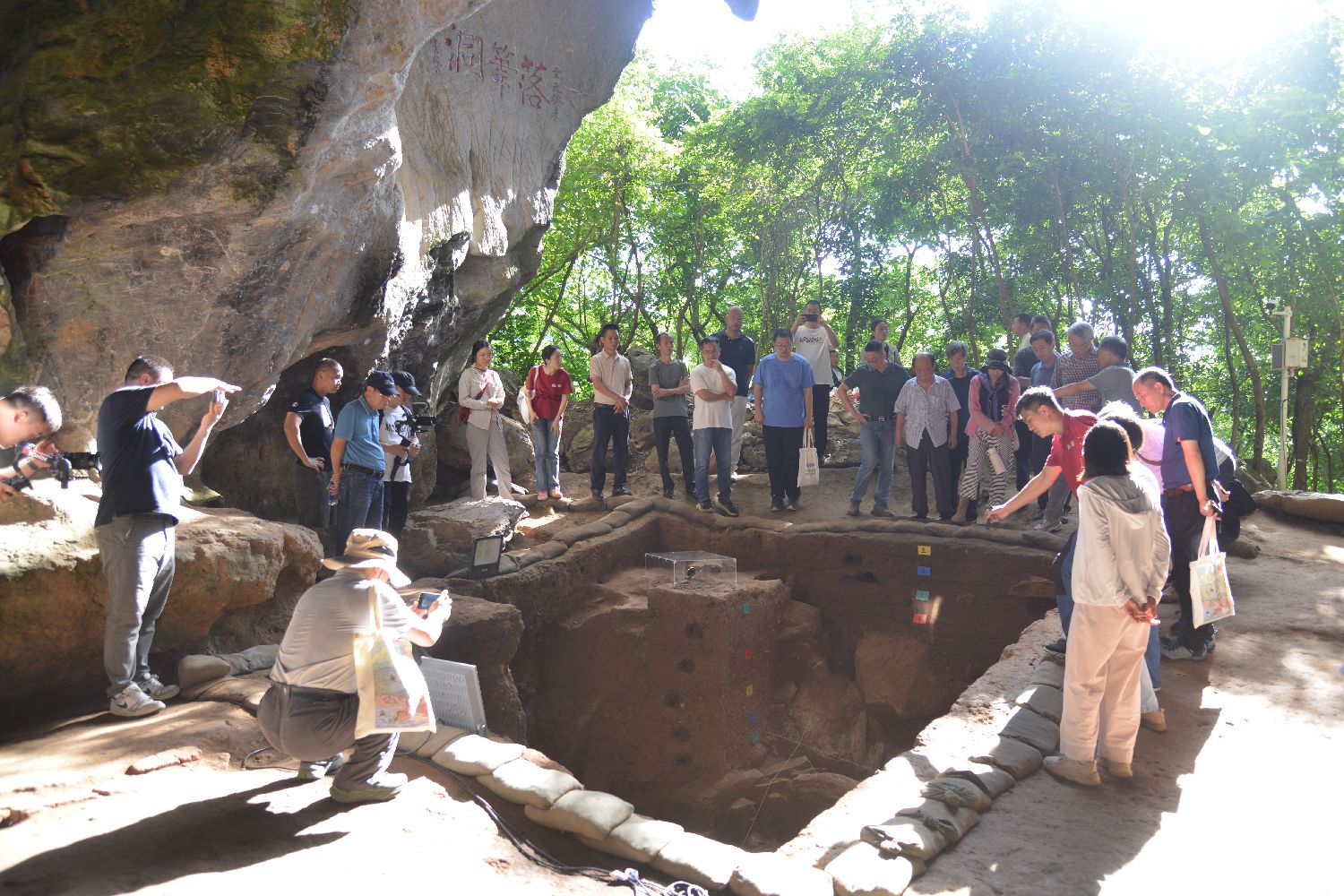 11月8日,来自全国各地的考古专家学者实地参观落笔洞遗址发掘现场。(图片来源:中新社)