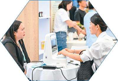一名参观者(右)在第七届中国—阿拉伯国家博览会现场体验中医经络检测仪。新华社记者 冯开华摄
