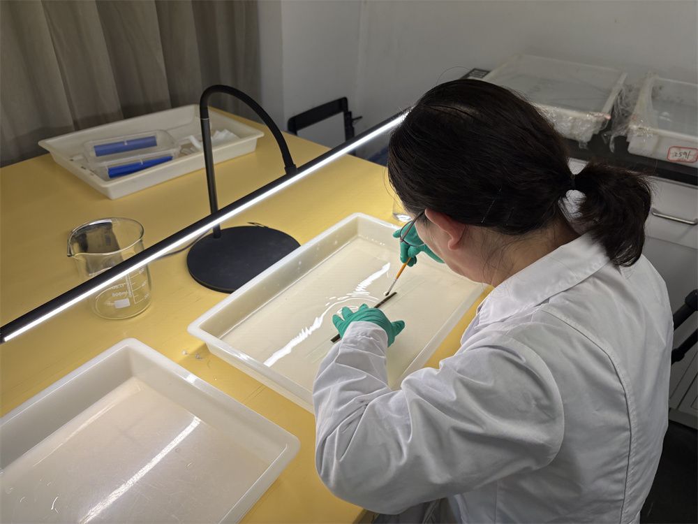 11月11日,在南昌汉代海昏侯国遗址博物馆的文物修复室内,工作人员正在清洗一枚简牍。(图片来源:中新社)