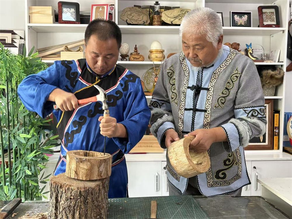 尤军指导儿子制作赫哲族乐器。(图片来源:本文图片均自中新网)