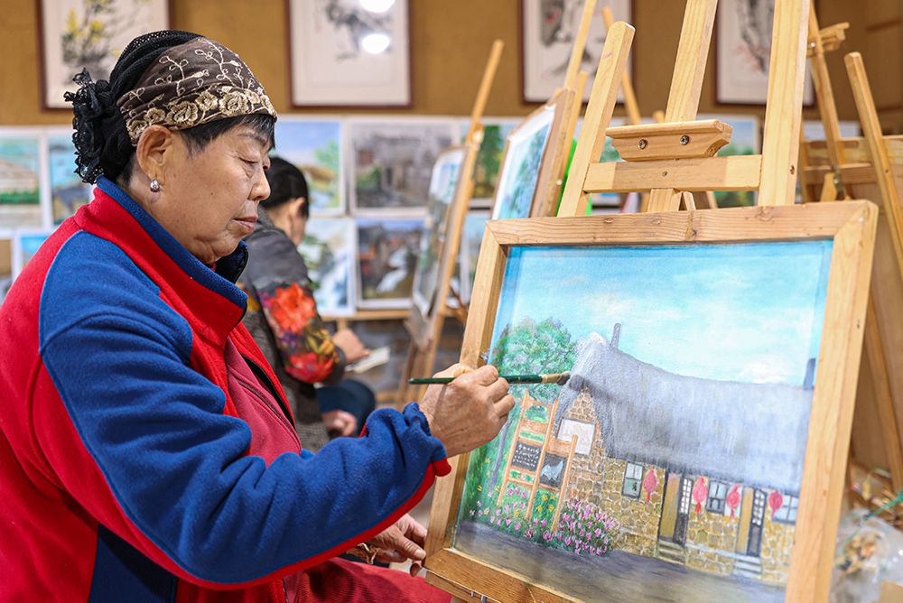 11月19日,“渔家画嫂”在山东荣成牧云庵村的画室里创作,画中的石头房是该村的特色景观。(图片来源:中新社)