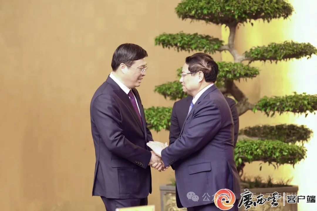 During the visit,Prime Minister Pham Minh Chính held working talks with the delegation.Le Hoai Trung,Secretary of the Secretariat of the CPV Central Committee and Minister of Foreign Affairs,also met with the delegation.Vietnamese leaders stressed that consolidating and developing friendly relations with China has always been Vietnam’s consistent policy,objective requirement,strategic choice,and top priority.They praised Guangxi’s special status and important role in Vietnam–China relations.Vietnam and Guangxi share mountains and rivers and enjoy long-standing friendship and close cooperation.Since the start of this year,top Guangxi Party and government officials have visited Vietnam successively,demonstrating Guangxi’s strong commitment to deepening cooperation with Vietnam.Vietnamese ministries,provinces and cities were urged to work with Guangxi to implement the important consensus of both Parties and both countries and the China–Vietnam Joint Statement,further enhance political mutual trust,strengthen strategic alignment,and promote practical cooperation in trade,investment,connectivity,artificial intelligence,digital economy,green development,clean energy and other emerging fields.Both sides should also deepen mechanisms such as the Spring Meeting between Guangxi Party Secretary and Leaders of Five Vietnamese Provinces and the Joint Working Committee Meeting,strengthen people-to-people exchanges,and jointly build a China–Vietnam community with a shared future of strategic significance,contributing to regional peace and prosperity.