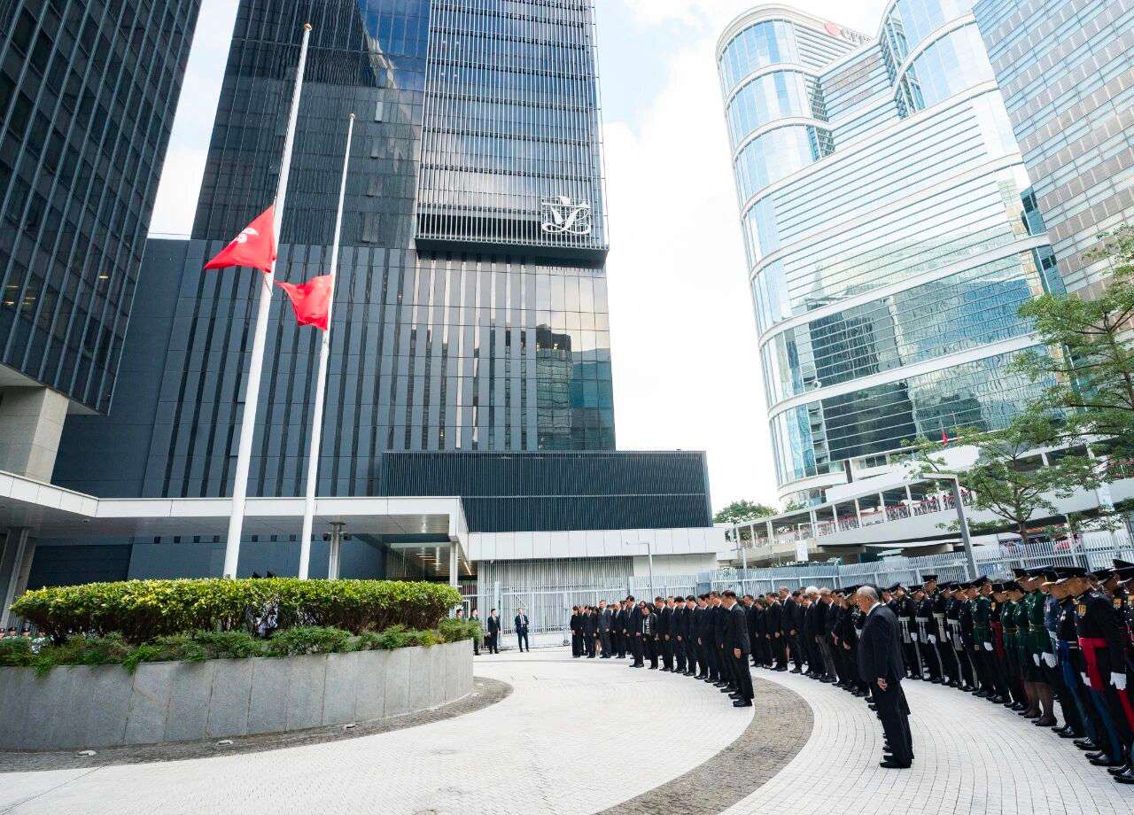 11月29日,香港特区政府在总部大楼前举行悼念活动,向大埔宏福苑火灾罹难者志哀。(图片来源:中新社)